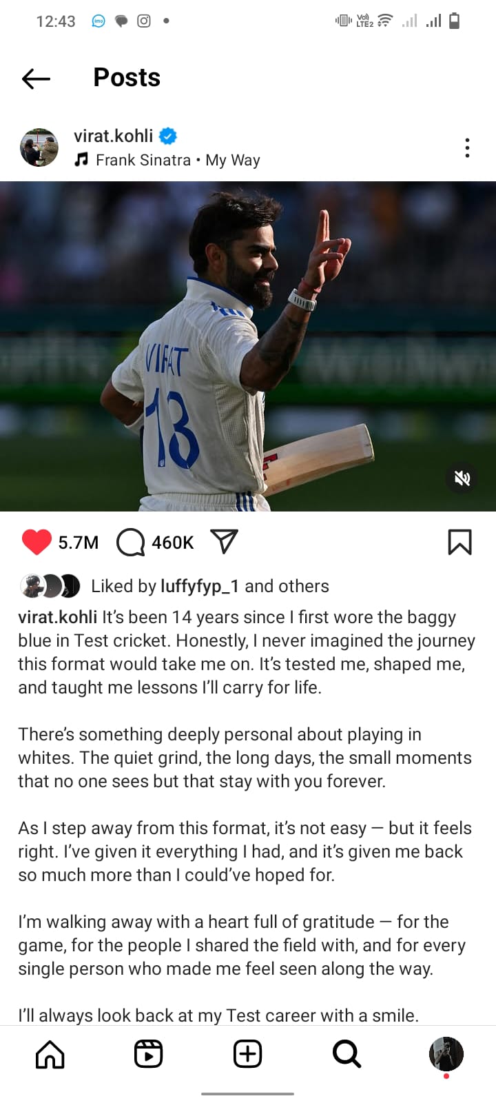 Kohli took to Instagram to share a heartfelt farewell with his fans:
